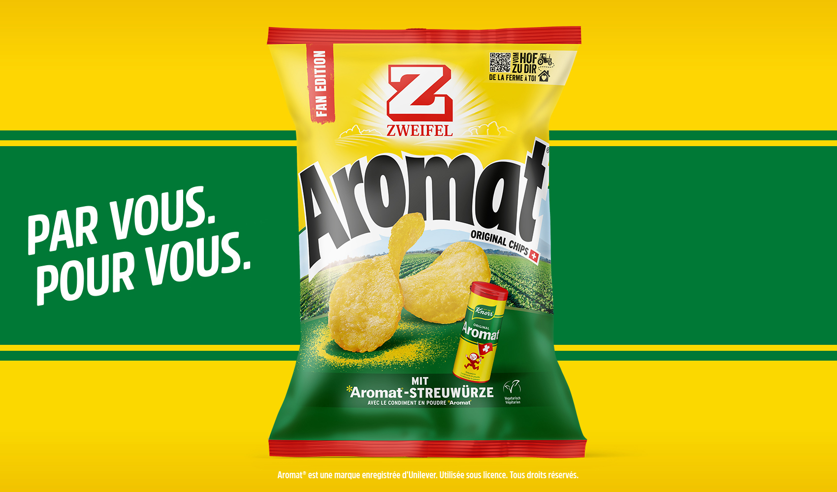 Sur les œufs à la coque, dans la sauce à salade et partout où on veut améliorer un peu le goût, Aromat® d'Unilever Suisse a sa place en Suisse depuis les années 1950, comme nos chips à l'apéritif. Aujourd'hui, deux produits culte se rencontrent pour donner naissance à un nouveau produit au goût on ne peut plus familier.