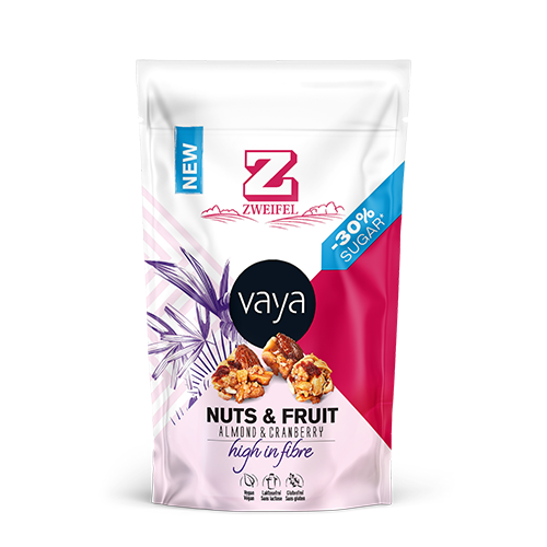 VAYA Nuts and Fruit Cranberry Almonds bestehen aus Erdnüsse, Mandeln und Cranberries. Sie sind reich an Ballaststoffen sowie Proteinquellen und enthalten 30% weniger Zucker als herkömmliche Nuss- und Fruchtriegel.