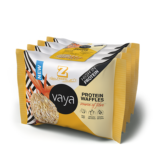 VAYA Protein Waffles bestehen aus grüne Erbsen, Linsen sowie gelbe Erbsen und Quinoa. Sie werden schonend zubereitet, sind reich an Protein sowie Ballaststoffquellen.