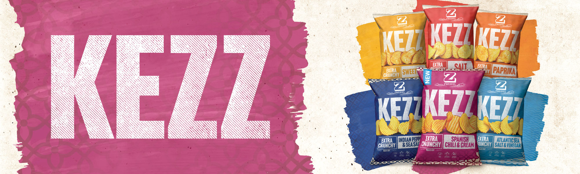 Der Name "Kesselchips" (aus dem Englischen "kettle chips") stammt von der Methode, mit der die KEZZ Chips hergestellt werden. In den USA bekannt geworden, wurden die Chips damals in kleinen Mengen in grossen Eisen- oder Stahlkesseln frittiert. Auch wenn heute keine grossen Kessel mehr im Einsatz sind, das Prinzip ist geblieben: Unsere KEZZ Kesselchips werden mit Schale rustikal geschnitten und dann Stück für Stück besonders sorgsam extra knusprig frittiert.