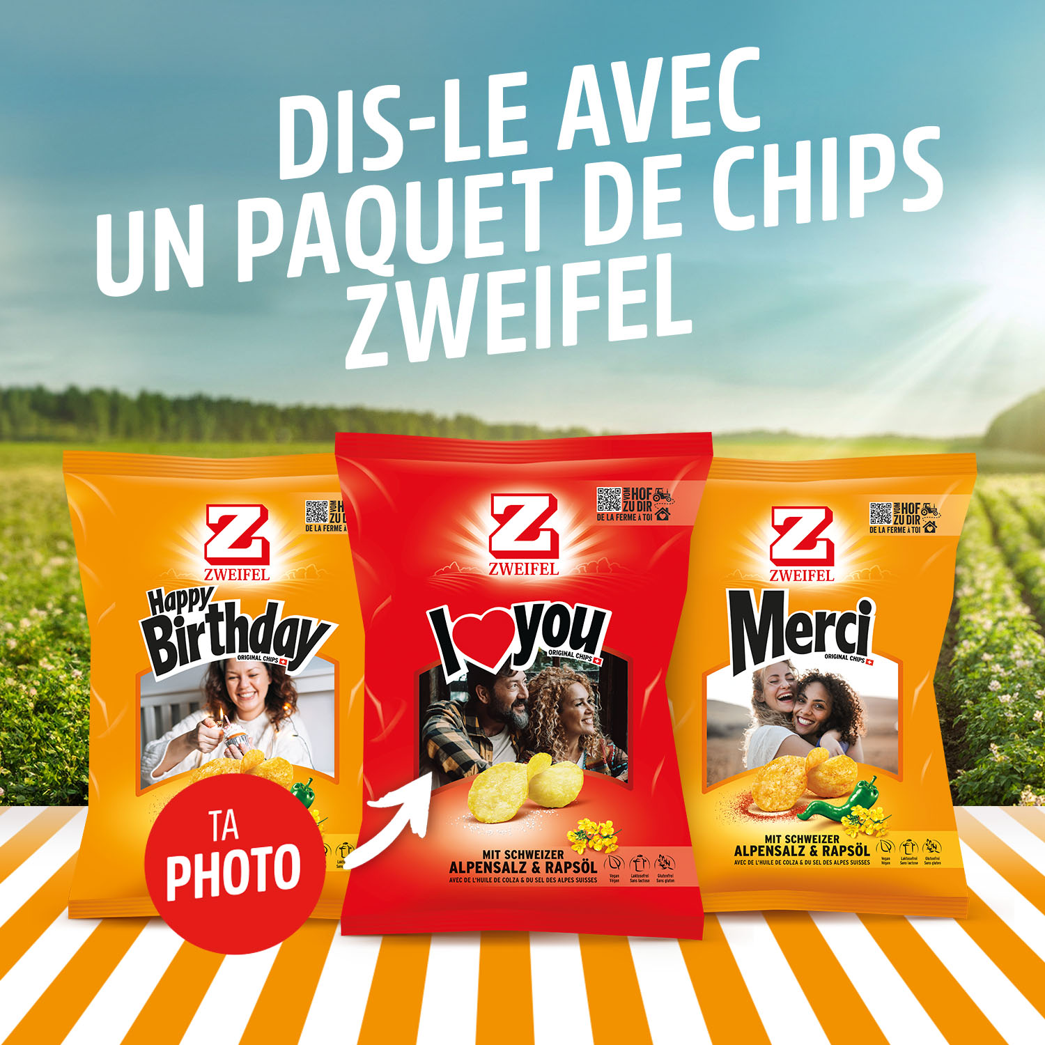 Accompagne les pommes de terre de ton sachet de chips tout au long de leur voyage, du champ de pommes de terre au rayon. Découvre toutes les mesures prises par nos agriculteurs pour offrir les meilleures pommes de terre. Suis tes chips préférées à travers notre production Zweifel. Découvre de nouvelles informations et des connaissances de base sur les pommes de terre, les chips et Zweifel.